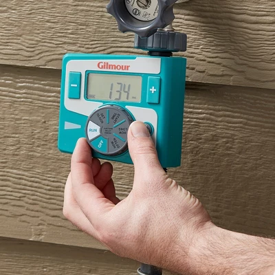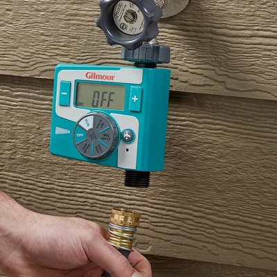 The ultimate time-saving, water-saving, money-saving tool for your lawn and garden. A timer automatically turns water on and off when you want it to. This Gilmour Single Outlet Electronic water Timer is simple to set and easy to use. It features a large LCD display with easy-to-read numbers and text making programming a breeze. The timer shuts off automatically after the programmed time has elapsed. The rain delay feature give you the ability to delay watering for 24, 48 or 72 hours. The On/Off function allows for manual watering. Constructed of durable high impact plastic, the timer eatures a metal swivel connection to the faucet that allows you to safety pull the hose around the yard without damaging the timer.