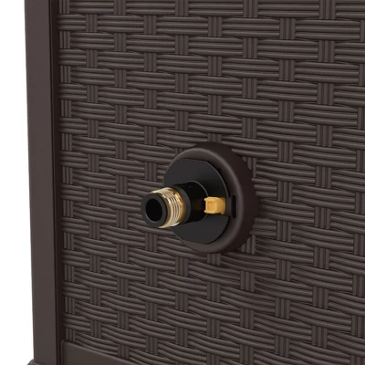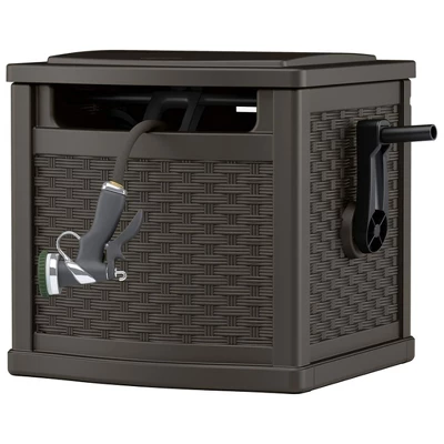 Bypass the mess of tangles and kinks, keep your water hose organized, and stash your reel out of sight with this Suncast 150-Foot Slide Trak Outdoor Garden Water Hose Hideaway.This garden watering hose and reel storage box is as beautiful as it is functional, with its rugged resin construction and stylish wicker pattern designed to complement any garden décor. Featuring a Slide Trak hose guide, this garden tool eliminates the struggles of wrapping the hose by hand and allows you to manually guide the hose to ensure even winding without touching the hose. Included brass connections allow for unbeatable functionality while helping to avoid leaks, cross-threading, and damage from outdoor elements.With its spacious outdoor storage capacity, you’ll be able to stow away up to 150 feet of standard 5/8-inch vinyl hosing and conceal the reel inside of a contemporary piece of garden furniture. Designed for ease of use, this garden hose holder is low maintenance and easy to clean. Enjoy versatile application in any outdoor patio, garden, or garage and setup the piece in no time with no tools required for assembly.When it comes to using the hose to water your yard, garden, or even wash your car, be prepared for all your watering needs with the 150-Foot Slide Trak Outdoor Garden Water Hose Hideaway from Suncast.