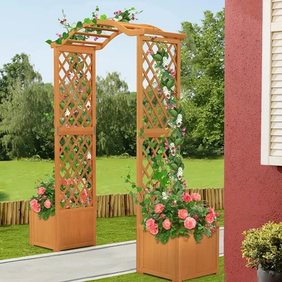 Creating a beautiful garden full of vitality with our wooden garden arch!Adopting natural fir wood, the garden arch is solid, deformation-resistant and built to last. Designed with arched tops and climbing trellis, you can keep basket plants and climbing plants healthy and thriving. Or you can DIY some decorations according to different occasions. Moreover, there are 2 planters on 2 sides, enabling you grow some flowers or vegetables. The planters comes with drain holes to promote water drainage. And the wooden planter arch is firmly connected by double metal hinges. Therefore, our garden arch is a perfect choice for gardening or ceremony as your preference!