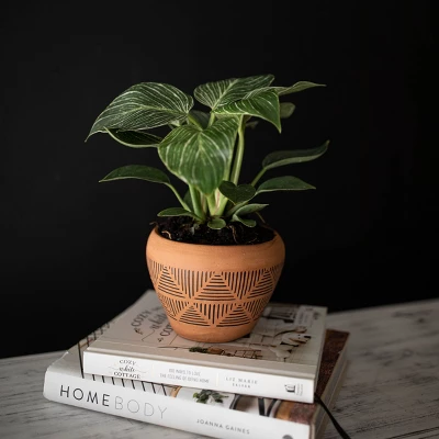Exclusively from Foreside Home & Garden, a terracotta pot that effortlessly pairs with your favorite plants. Hand thrown from natural terracotta clay by artisans in India, and hand painted with a modern black geometric pattern. The rich terracotta color is the perfect background for the bold black triangle striped design, while the round tapered shape softens the look. The neutral colorway of this planter makes it seamlessly transition from warm to cool seasons. Elevate the look of your greenery with its timeless design.